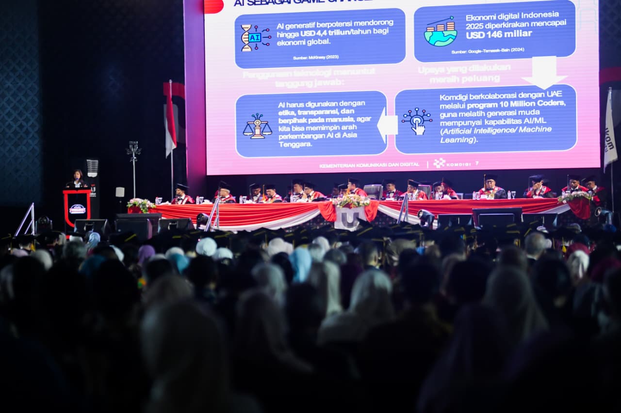 Selain itu, Menkomdigi juga mengajak para lulusan untuk menjadi bagian dari solusi dalam menghadapi dampak negatif teknologi, seperti kecanduan digital, manipulasi algoritma, hingga penyebaran konten yang merusak nilai sosial dan budaya.