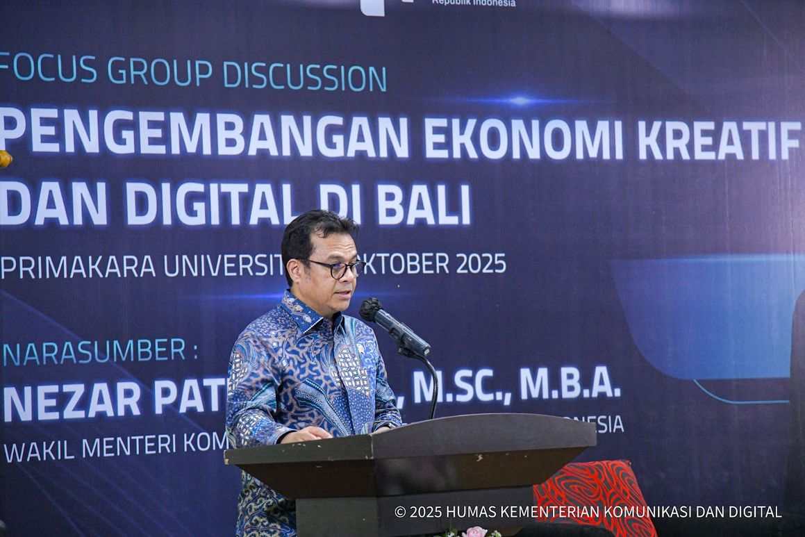 “Pemerintah berkomitmen untuk memperkuat infrastruktur yang merata dan berkualitas, pengembangan talenta digital kreatif dan kompeten, serta tata kelola yang berlandaskan etika teknologi. Ketiga aspek ini menjadi kunci agar ekonomi digital dan kreatif Indonesia tumbuh secara berkelanjutan dan inklusif,” ujar Nezar dalam Keynote Speech dan FGD Pengembangan Ekonomi Kreatif dan Digital di Primakara University, Denpasar, Bali, Jumat (31/10).